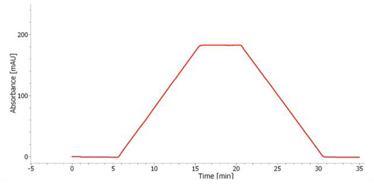 La méthode traditionnelle et généralement acceptée pour la validation des gradients dans un système HPLC repose actuellement en grande partie sur l’assistance d’un détecteur UV. Pour un gradient binaire, on utilise généralement de l’eau pure et de l’eau contenant 0,1% d’acétone. La détermination de l’absorbance de l’acétone en fonction du temps représente très précisément le gradient effectué par le système.
